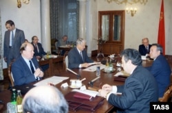На заседании Госсовета СССР в Ново-Огарево обсуждают проект нового Союзного договора. В заседании, проходящем под председательством президента СССР М. Горбачева принимают участие президент РСФСР Б. Ельцин, председатель Верховного Совета Беларуси С. Шушкевич, президент Казахстана Н. Назарбаев, президент Азербайджана А. Муталибов, президент Кыргызстана А. Акаев, заместитель председателя Верховного Совета Таджикистана А. Искандеров, председатель Верховного Совета Туркменистана С. Муратов. Москва, 13 ноября 1991 года.