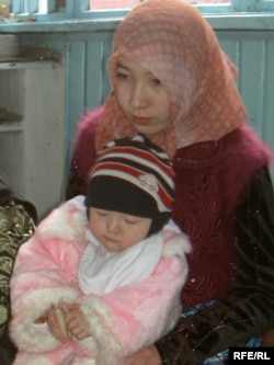 Назокат, вдова независимого журналиста Алишера Саипова, с его дочерью Зулайхой, на поминках через год. Ош, 24 октября 2008 года.