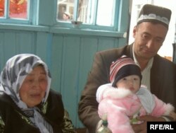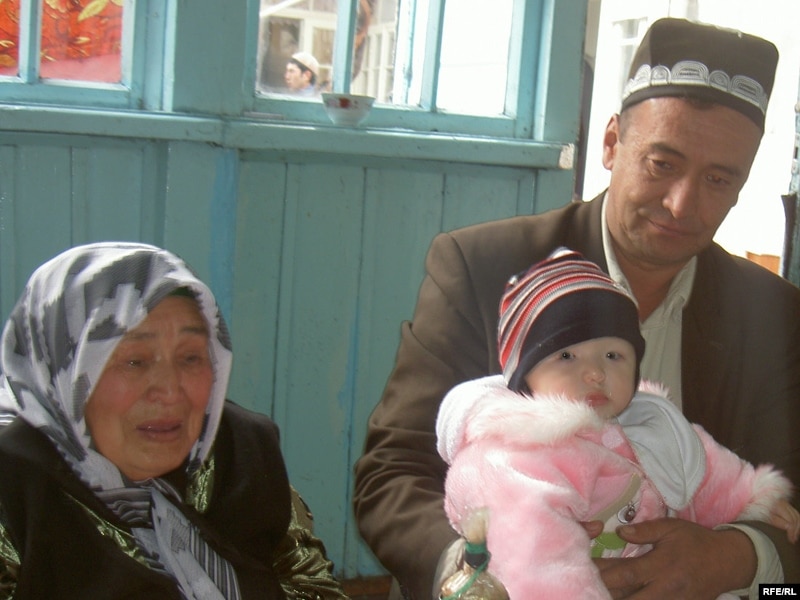 Авас Саипов и Розахан, отец и бабушка убитого журналиста Алишера Саипова, с его дочерью Зулайхой, на поминках через год. Ош, 24 октября 2008 года.