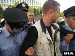 Полиция уводит журналиста Сергея Дуванова, устроившего акцию протеста против поправок в Конституцию, которые сняли с Нурсултана Назарбаева ограничение избираться в президенты не более двух раз. Алматы, 24 мая 2007 года.