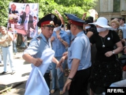 Полицейские отбирают плакаты у участников акции протеста в защиту свободы слова. Алматы, 24 июня 2009 года.