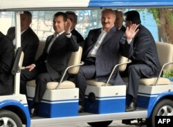 Президенты России Дмитрий Медведев и Беларуси Александр Лукашенко машут фоторепортерам во время неформального саммита ОДКБ в Кыргызстане. Чолпон-Ата, 31 июля 2009 года.