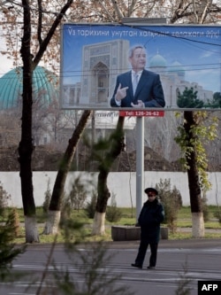Полицейский на фоне предвыборного билборда узбекского президента Ислама Каримова. Ташкент, 21 декабря 2007 года.