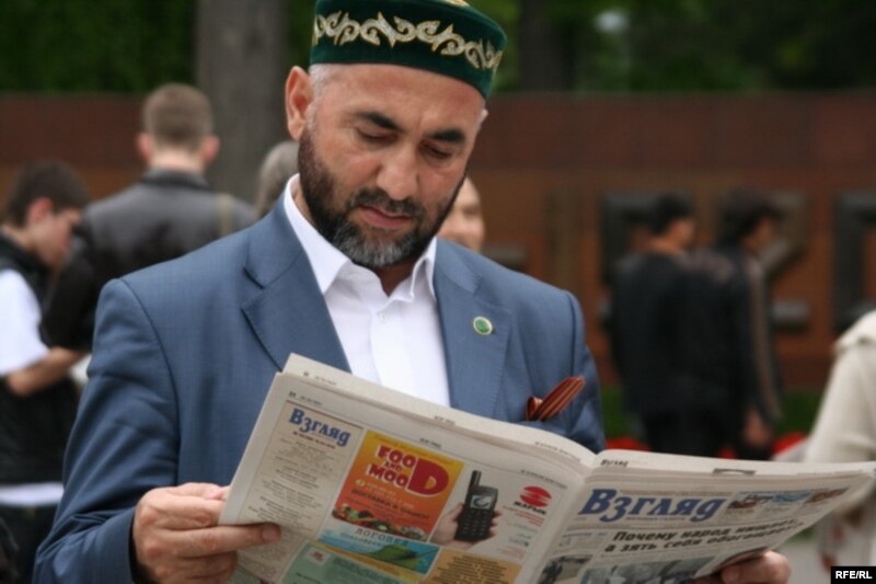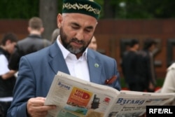 Заинтересованное чтение газеты, распространяемой активистами партии "Алга" в парке имени 28 гвардейцев-панфиловцев. Алматы, 1 мая 2010 года.