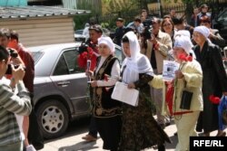 Женщины в белых платках пытаются совершить шествие, чтобы возложить цветы к Монументу Независимости. Посередине - поэтесса Айсулу Кадырбаева. Алматы, 1 мая 2010 года.