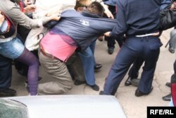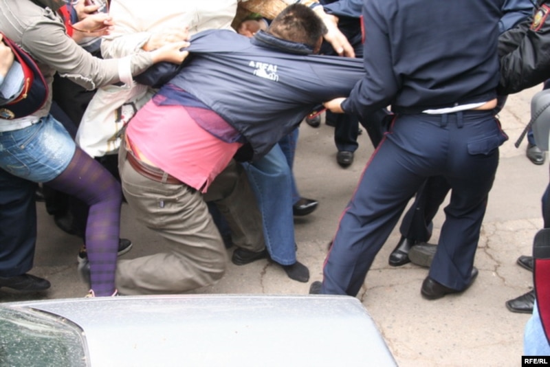 Полиция производит арест активиста оппозиционной партии «Алга» Бозжана Куракбаева после собрания, приуроченного к Первомаю. Алматы, 1 мая 2010 года.