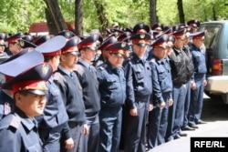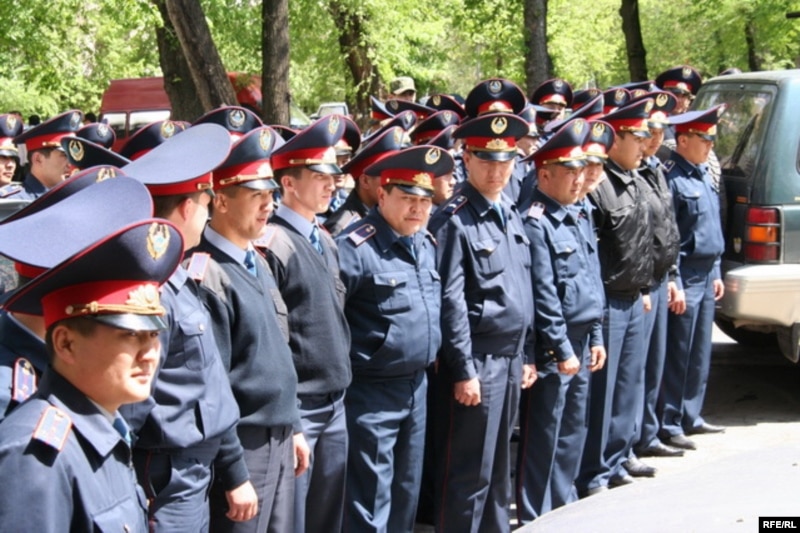 Полицейское оцепление вокруг офиса партии "Алга", где проходит собрание демократической общественности, приуроченном к Первому Мая. Алматы, 1 мая 2010 года.