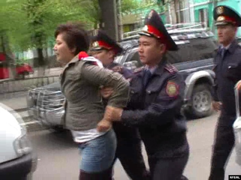 Полиция производит задержание журналиста оппозиционной газеты «Республика» Жанны Байтеловой во время акции протеста. Алматы, 1 мая 2010 года.