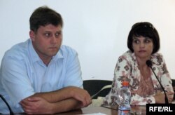 Адвокат Сергей Уткин и заместитель главного редактора газеты "Республика" Оксана Макушина на пресс-конференции. Алматы, 25 августа 2009 года.