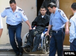 Жасулана Сулейменова, обвиняемого в терроризме, выводят из Алматинского суда Астаны. 19 августа 2009 года.