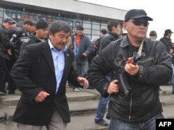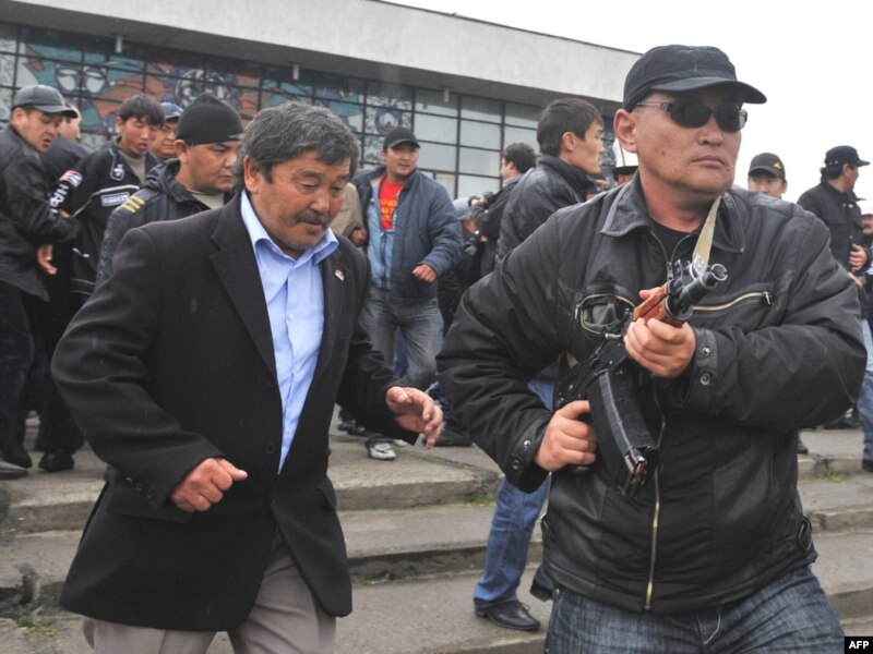 Телохранители бывшего президента Курманбека Бакиева расчищают ему дорогу для бегства во время столкновений в ходе митинга в городе Ош 15 апреля 2010 года.
