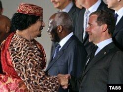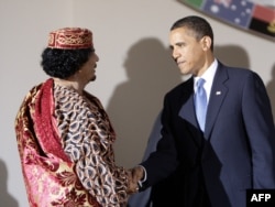 Лидер Ливии Муаммар Каддафи и президент США Барак Обама на саммите «Большой восьмерки» в Италии. Л-Акуила, 9 июля 2009 года.