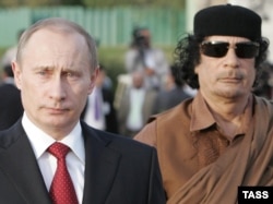 Президент России Владимир Путин и лидер Ливии Муаммар Каддафи в резиденции Каддафи. 16 апреля 2008 года.
