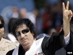 Лидер Ливии Муаммар Каддафи делает победный жест, прибыв на саммит «Большой восьмерки» в Италии. Л-Акуила, 10 июля 2009 года.