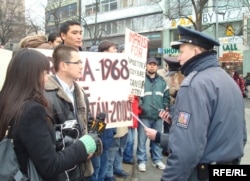 Офицер чешской полиции удостоверяется в том, что демонстрация протеста казахских беженцев-мусульман санкционирована властями. Прага, 7 февраля 2009 года.
