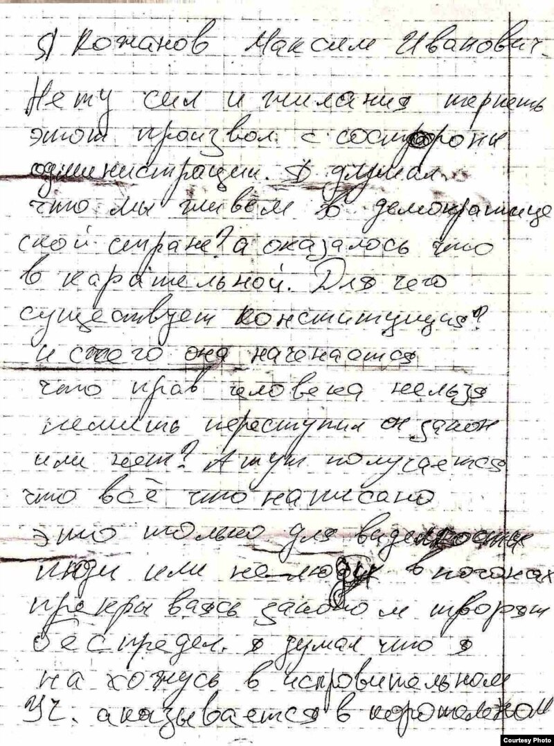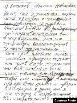 Фотокопия фрагмента письма предположительно погибшего заключенного тюрьмы в поселке Долинка Максима Кожанова, предоставленного правозащитником Вадимом Курамшиным. Снимок сделан правозащитником Андреем Цукановым.