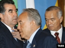 Таджикский президент Эмомали Рахмон, казахский президент Нурсултан Назарбаев, узбекский президент Ислам Каримов. Москва, 8 мая 2005 года.
