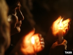 Женщина со свечой скорбит о жертвах войны в Южной Осетии в августе 2008 года. Цхинвали, 8 августа 2009 года.