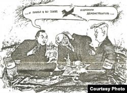 Сатирический рисунок пародирует известное высказывание Нурсултана Назарбаева, что он пошел во главе колонны демонстрантов в Алматы в декабре 1986 года. Рядом с ним изображены Михаил Горбачев и Борис Ельцин. Рисунок из независимой газеты "С-Демократ" 1992 год. Издатель и редактор - Андрей Свиридов.