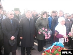 Жармахан Туякбай (второй слева) и другие участники митинга возлагают цветы на площади Республики в день памяти Декабрьских событий. Алматы, 17 декабря 2008 года.