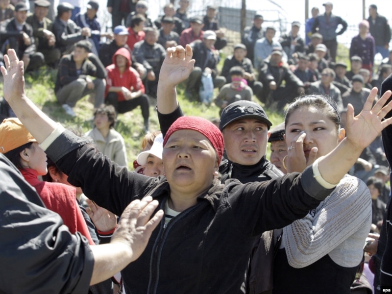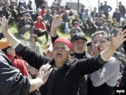 Люди скандируют лозунги во время митинга в поселке Нижняя Алаарча близ Бишкека. 20 апреля 2010 года.