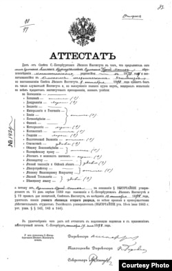Аттестат Алихана Букейханова об окончании в 1894 году Императорского Санкт-Петербургского лесного института. Из центрального государственного исторического архива Санкт-Петербурга. Сентябрь, 2009 года.