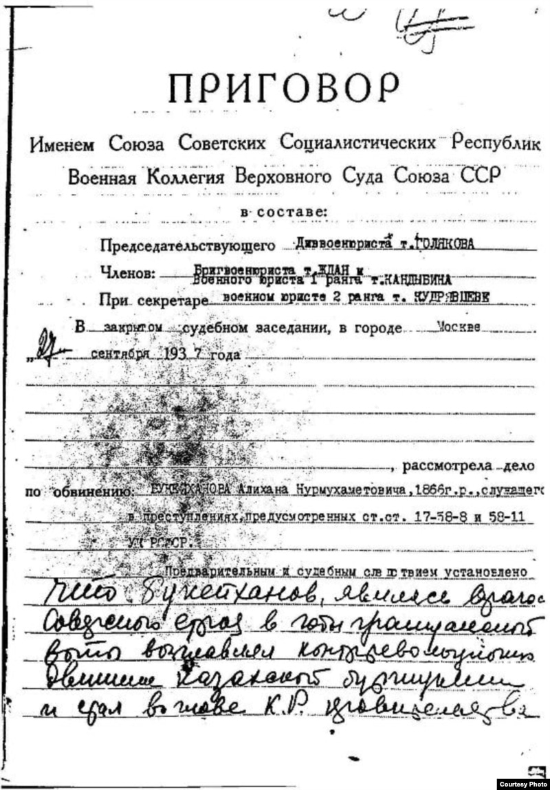 Далее уже следует и сам приговор - очередной и привычный вердикт печально известной «тройки» из Военной Коллегии Верховного суда СССР от 27 сентября 1937 года, приговорившей Букейхана, как дословно написано в документе, «к высшей мере уголовного