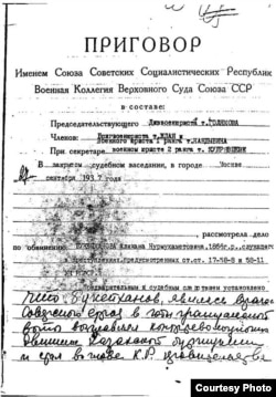 Копия приговора Военной коллегии Верховного суда СССР от 27 сентября 1937 года, в соответствии с которым национальный лидер казахов Алихан Букейханов приговорен к смертной казни без права на обжалование. Из архива ФСБ РФ. Москва, февраль 1995 года.