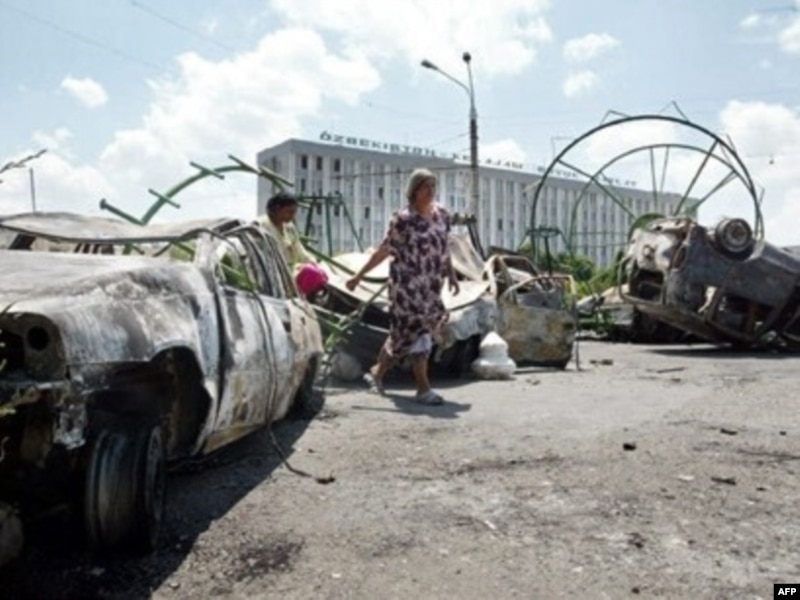 Жители Андижана проходят мимо машин, сгоревших в результате столкновения демонстрантов с силами безопасности. 14 мая 2005 года.
