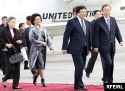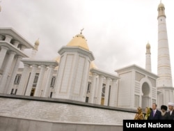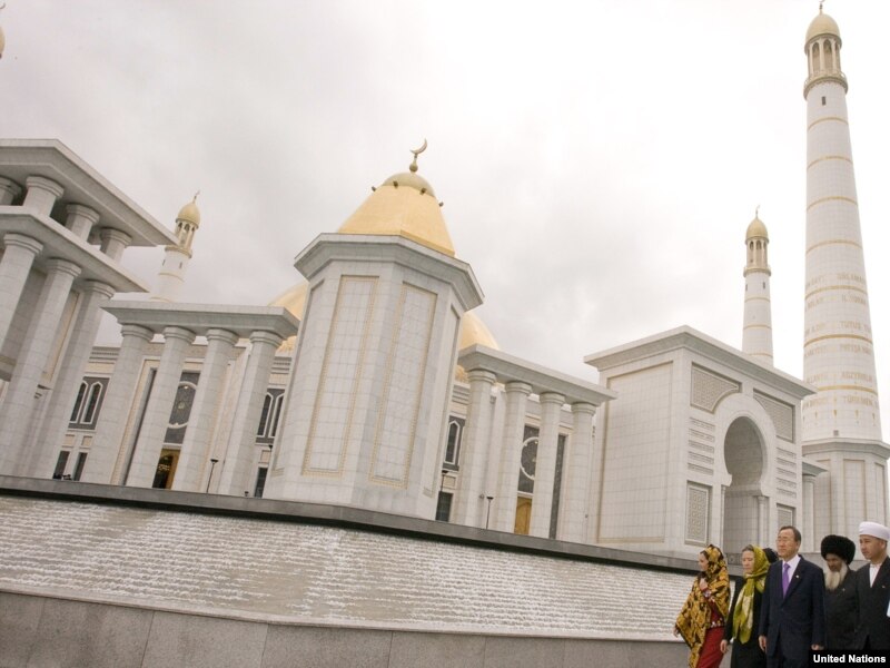 Делегация ООН во главе с генсеком Пан Ги Муном осматривает мечеть и мавзолей на окраине Ашгабата. 2 апреля 2010 года.