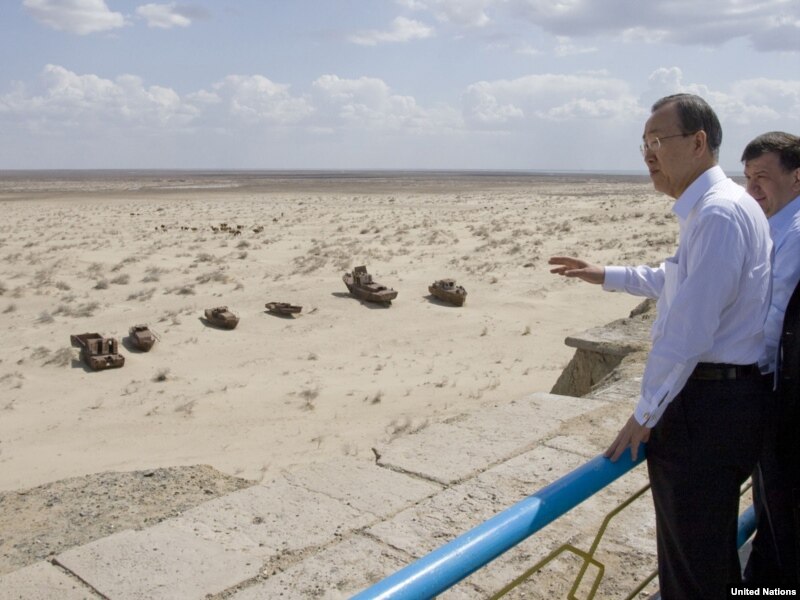 причиной многих болезней.Глава ООН Пан Ги Мун 4 апреля облетел озеро Арал на вертолете. «На месте озера я ничего не видел, я мог видеть только кладбище судов. Это - одно из наихудших экологических бедствий в мире. При виде состояния озера я был потрясен», - заявил он репортерам после прибытия в Нукус, столицу автономного Каракалпакстана в Узбекистане, отмечает газета.