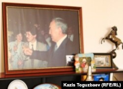 Фотография с изображением президента Нурсултана Назарбаева (справа) в теплой компании с Бигельды Габдуллиным (в середине) во время встречи по итогам Всенародного референдума 1995 года, продлившего полномочия президента Назарбаева. Фотография висит в кабинете главного редактора газеты "Централ Азия Монитор" Бигельды Габдуллина.