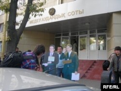 Журналисты газеты «Республика» проводят акцию протеста с картонными макетами руководителей БТА банка Анвара Сайденова и Армана Дунаева. Алматы, 8 сентября 2009 года.