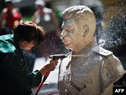 Сотрудник Национальной художественной галереи чистит бюст Сталина. София, Болгария, 23 июня 2009 года.