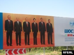 Билборд с изображением Ислама Каримова, Владимира Путина, Нурсултана Назарбаева, Ху Цзиньтао, Эмомали Рахмона и Курманбека Бакиева. Накануне саммита стран - участниц ШОС в Кыргызстане. 16 августа 2007 года.