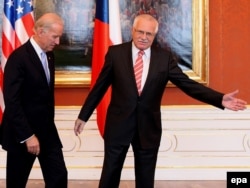 Президент Чехии Вацлав Клаус приветствует вице-президента США Джо Байдена в своей резиденции. Прага, 23 октября 2009 года.