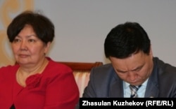 Посол по особым поручениям Мадина Джарбусынова и секретарь комиссии по правам человека Тастемир Абишев в ходе заседания круглого стола по правам человека. Астана, 28 апреля 2011 года.