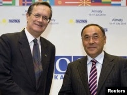 Министр иностранных дел Казахстана, действующий председатель ОБСЕ Канат Саудабаев (справа) приветствует генерального секретаря ОБСЕ Марка Перрина де Бричамбаута. Алматы, 16 июля 2010 года.