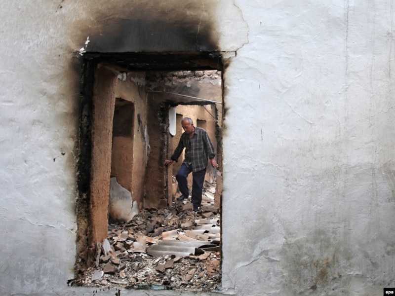 Житель Оша посреди развалин своего дома, разрушенного в ходе этнического конфликта. 17 июня 2010 года.