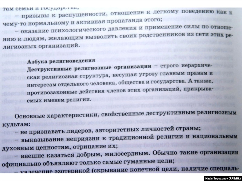Что же касается «действующего» учебника по религиоведению Досая Кенжетаева, то в нем есть уже параграф «Характеристика деструктивных религиозных течений».