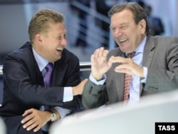 Глава компании «Газпром» Алексей Миллер (слева) с бывшим канцлером Германии Герхардом Шрёдером (справа) на экономическом форуме. Санкт-Петербург, 18 июня 2010 года.