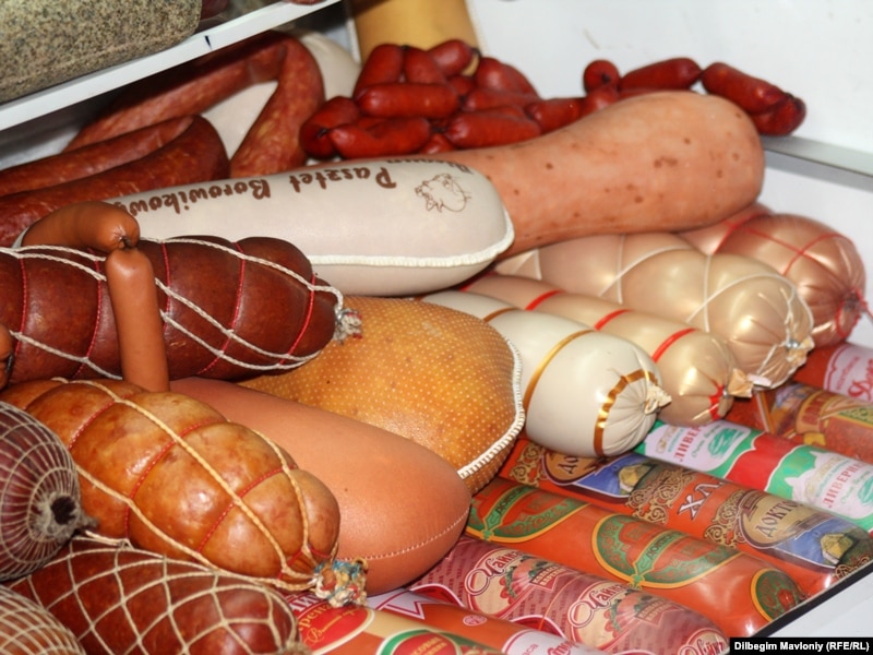 Халалные колбасные изделия, представленные на выставке сельскохозяйственной продукции. Алматы, 2 ноября 2010 года.