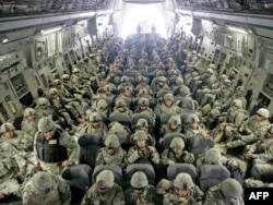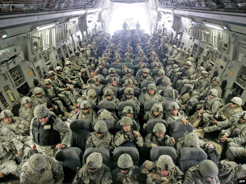 Американские солдаты, прибывшие из Афганистана в транзитный центр перевозки грузов "Манас" в Кыргызстане. 26 февраля 2009 года.
