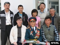 Участники голодовки с ветераном Второй мировой войны полковником в отставке Зейноллой Омиржановым (слева-направо: в первом ряду - Жасарал Куанышалин, Зейнолла Омиржанов, Жусуп Ергалиев; во втором ряду - Ербол Нургалиев, Жанибек Имамазиров, жена Ермека Нарымбаева - Зоя (она не голодает, но представляет здесь своего мужа), Мухамеджан Кудысулы, Куралбек Акназаров.
