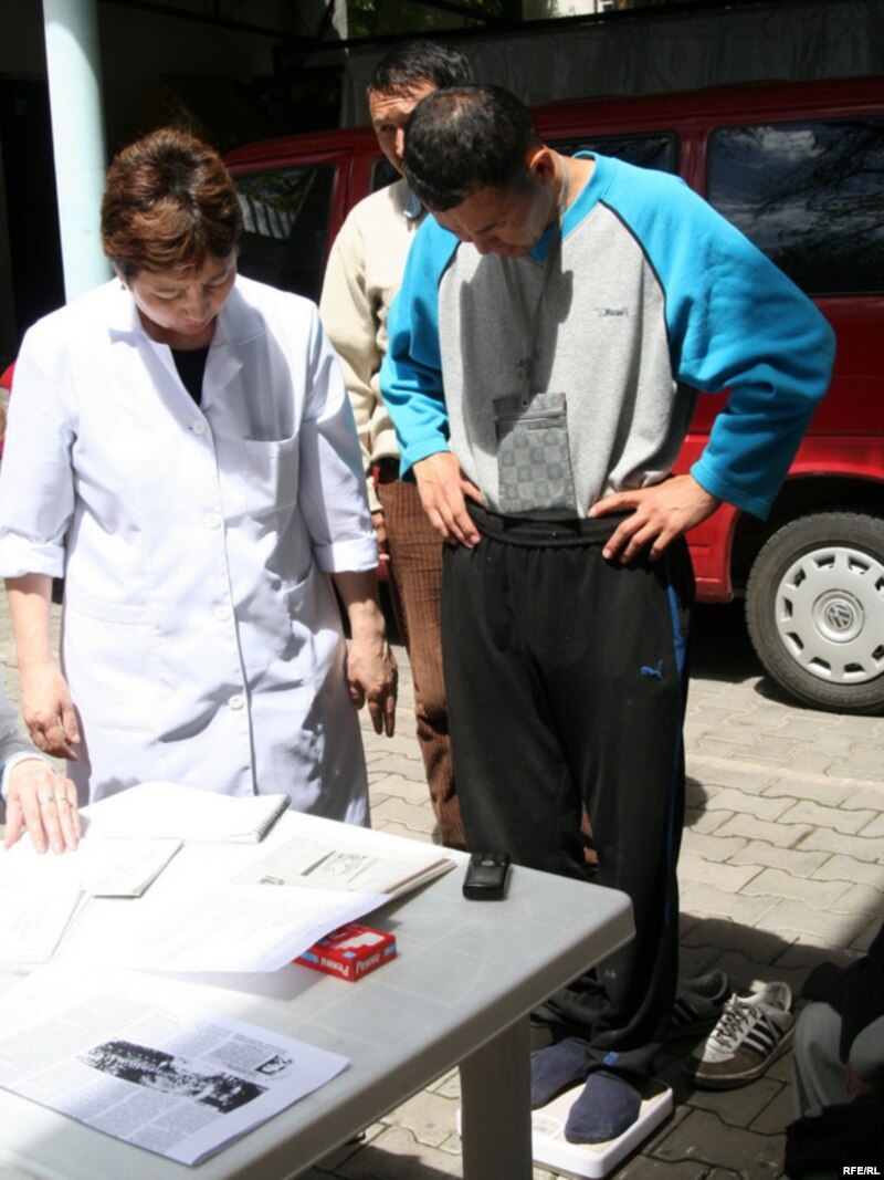 Врачи произвели взвешивание участников голодовки. Затем врачи проверили пульс, прослушали сердце и легкие, а также замерили кровяное давление. При этом у одного из участников голодовки Ербола Нургалиева оказалось низкое давление: 80 на 35. К тому же у него была обнаружена хроническая астма. В связи с этим врачи порекомендовали ему лечь в больницу. Однако он отказался.