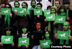 Акция в поддержку протестов в Тегеране. Зеленый цвет их лиц символизирует симпатию к протестующим, а красный - соболезнование в связи с гибелью демонстрантов. Париж, 29 декабря 2009 года.