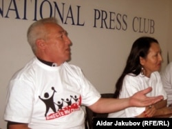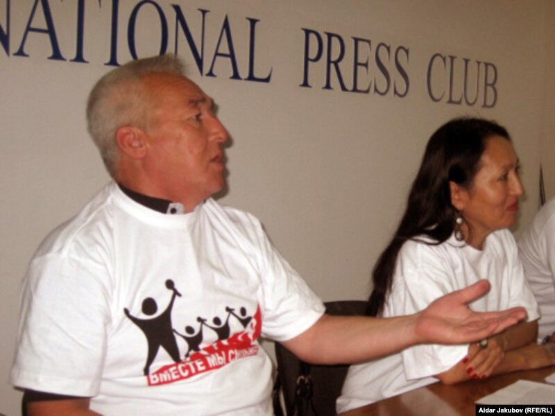 Председатель правления Союза журналистов Казахстана Сейтказы Матаев (слева) и Галия Аженова, сотрудница организации "Адил соз" (справа). Алматы. 8 сентября 2010 года.