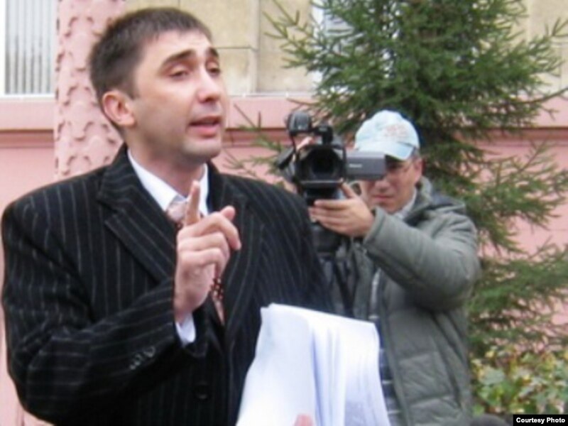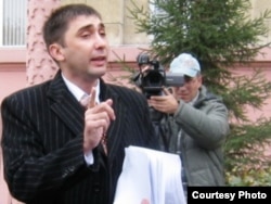 Правозащитник Вадим Курамшин проводит пресс-брифинг возле здания Карагандинского областного суда. Караганда, 28 сентября 2010 года. Фото сделано правозащитником Андреем Цукановым.