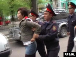 Полиция производит задержание журналиста оппозиционной газеты «Республика» Жанны Байтеловой во время акции протеста оппозиции. Алматы, 1 мая 2010 года.