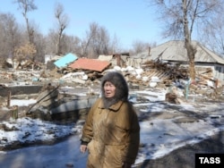 Жительница села Кызылагаш на фоне разрушений в результате наводнения. 14 марта 2010 года.